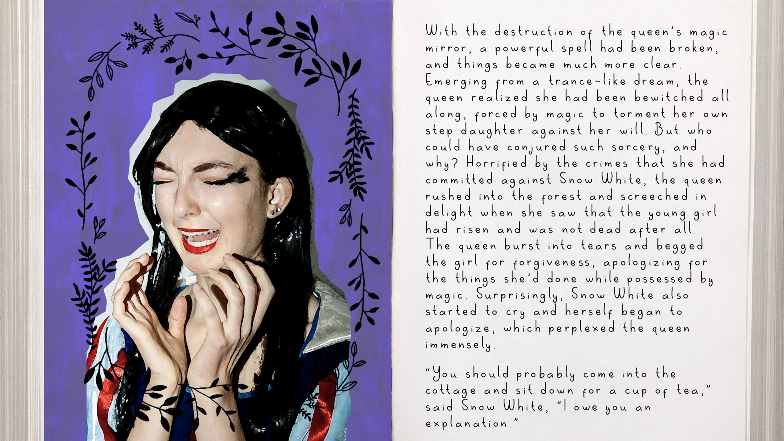 As part of the Kunsthall Stavanger’s Mobilizing Citizenship initiative, Toxic Waste Face was invited to lead a group of young adults in a critical exploration of their visual surroundings, challenging the dominating aesthetic standards and exploring the conceptions of what makes something beautiful. But how are these visual standards and conventions developed in the first place? With this in mind - of excavating the origins of these structures - we turned our collective eye to the realm of folklore, as fairy tales and fables often represent a person’s first encounter with morality and value judgements like good or bad, beautiful or ugly. We figured there was no better way to destabilize dominating standards than to subvert the very source, so we chose to mount a multi-media “resurrection” of the Snow White myth, a tale laden with value judgements on a person’s perceived worth based exclusively on their appearance. An aging queen consumed with jealousy - a young girl whose beauty is at once a death note and her salvation - but what if we re-wrote the narrative? However, as a nod to the denial of Snow White’s decision making power in her own story, we offered the youth artists only the semblance of agency, tasking them to revise the tale using only Mad-Libs-style fill-in-the-blanks up until the conclusion, which they then re-wrote (unfettered) to consider alternate endings that renegotiated the original moral framework. From this new script, written collaboratively, we created a “digital storybook” (or web-based audio-visual artwork) of the new allegory, SNOW WHAT!?, featuring the youth cohort as cast, crew, and producers.